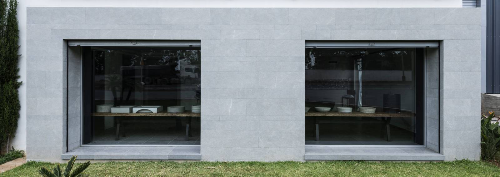 Cette façade contemporaine en pierre naturelle Kahla gris finition flammée brossée évoque l’aspect du béton tout en offrant la noblesse, la durabilité et la sobriété de la pierre. Résistante et élégante, elle incarne un style affirmé et intemporel.