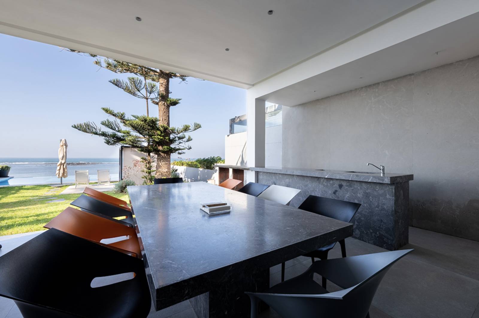 À Skhirat, cette villa de plage associe avec élégance marbre Saint Maure gris veiné blanc, calcaire Avallon gris clair et granite Noir Zimbabwe. L’ensemble crée une véranda moderne et conviviale, en harmonie avec la nature et les lignes architecturales épurées.